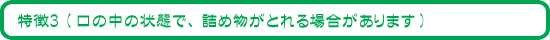 治療したとしても治療の跡は残ってしまうものです。 (カゼなどの病気とは違う) ●口の中の状態は、 A いつも湿潤しています B 上下・左右の咬合圧がかかります C 温度差のある食べ物や飲み物を常に取っています(4℃〜60℃) それらによって歯とそれに詰めたものが、取れたりする原因となります。 |