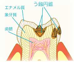 虫歯は、上から見ると小さくても、表面のエナメル質の下の象牙質では広がっています。 |
